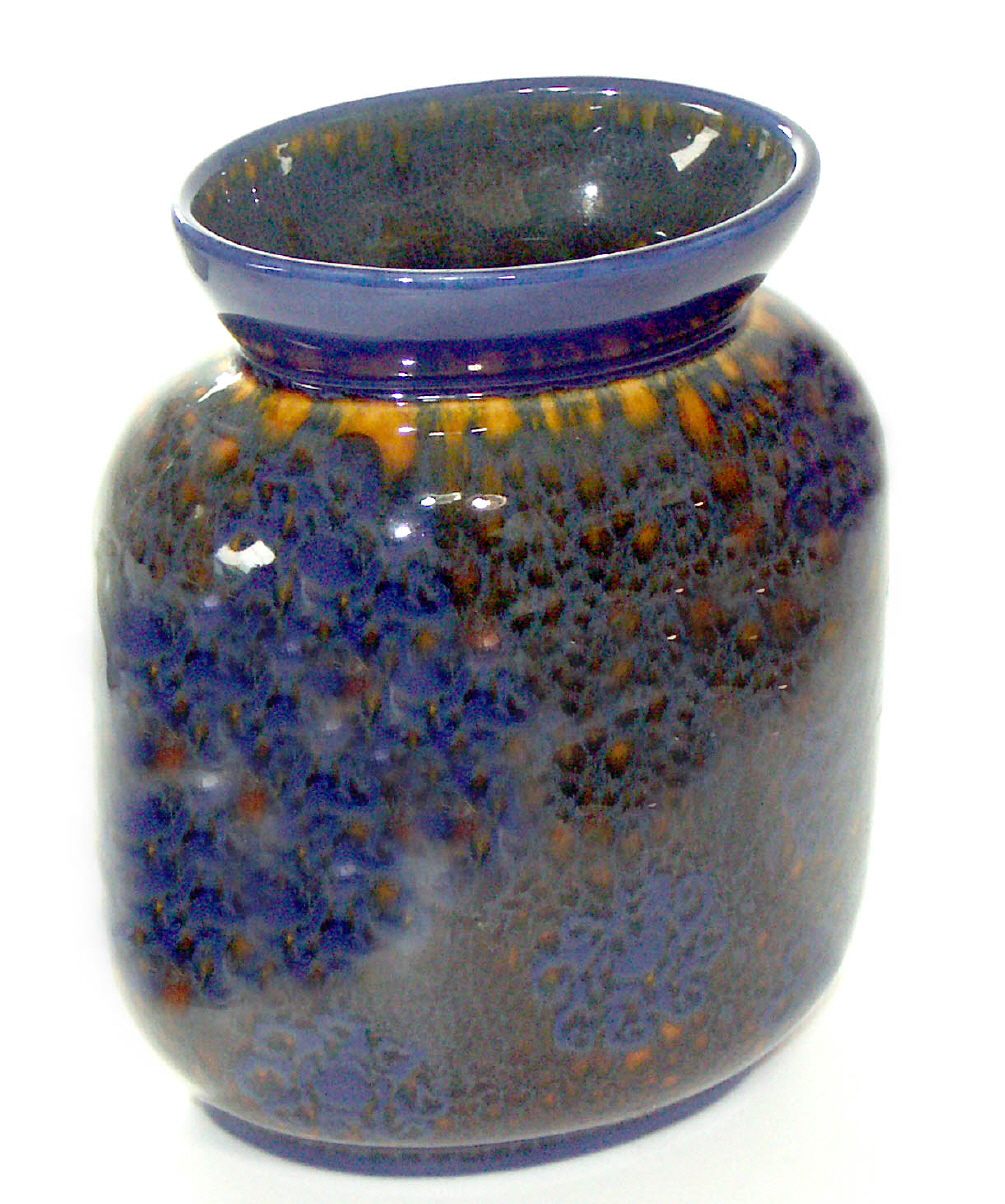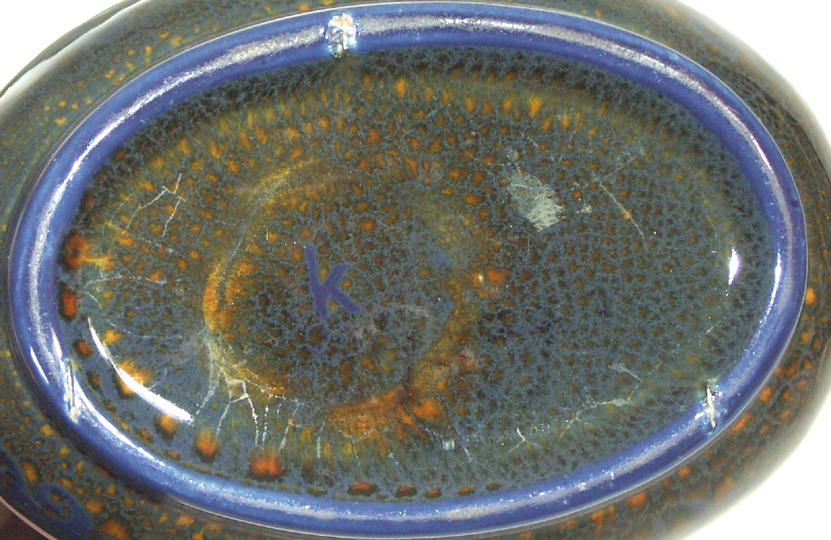 Bestellnummer 3007 Ovale Vase Vordamm Blau grüne Glasur mit unregelmäßigen floralem Muster auf gelben Grund darüber Transparentglasur Höhe ca. 20cm; Durchmesser ca. 16x12cm, keine Beschädigung, einwandfreier guter Zustand Am Boden bezeichnet: schwach erkennbare Werkstattmarke / Manufakturmarke plus „K“ EUR 65,00 Anfrage |