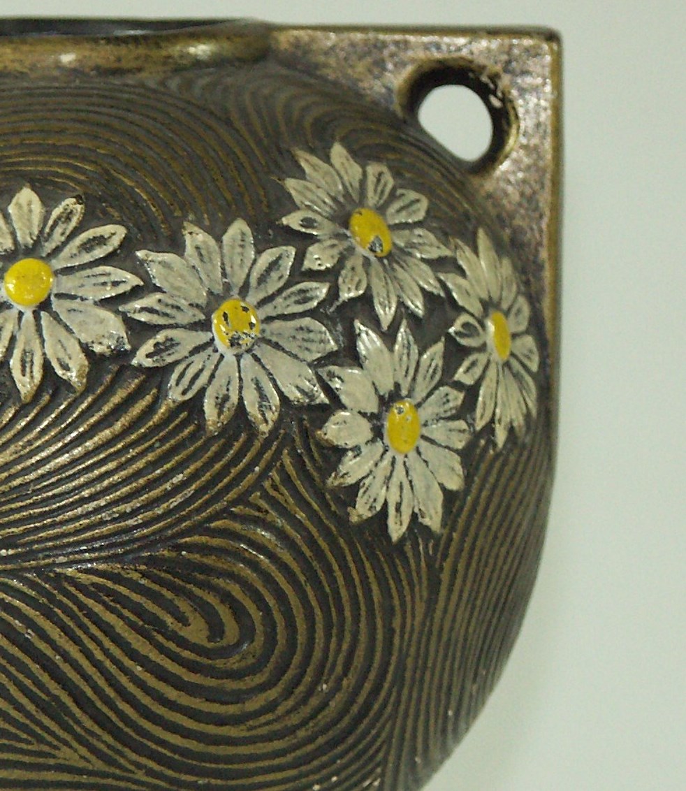 Bestellnummer: 2002 Henkelvase mit interessanter gestalteter Rillenoberfläche grauer Steingutscherben mit teilweiser Kaltbemalung, Grundfarbe Bronze und die Rillen schwarz „gefüllt“. Die weißen Blüten haben gelbe Glasurpunkte Höhe ca. 11,5 cm; Durchmesser ca. 14 cm, kleine Unregelmäßigkeiten im Rillendekor (siehe Foto) sonst guter Zustand Am Boden bezeichnet: mit Modellnummer 1299, Ausführung wohl vor 1910. EUR 35,00 Anfrage |